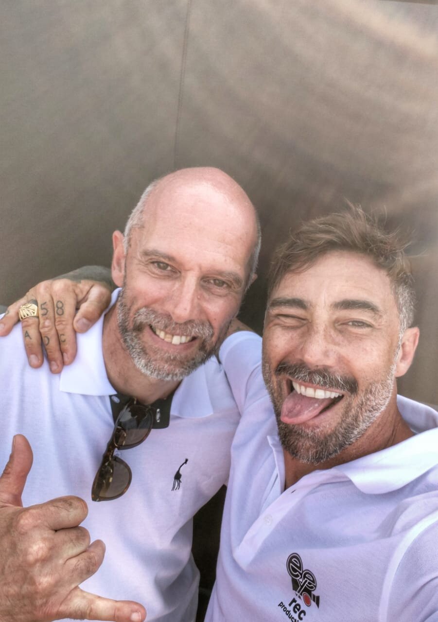 Foto 1: un diverito Roberto Battista, Vicesindaco di Sellano assiste alle prove di discesa. Foto 4: Vittorio Brumotti scherza con Paolo Borroi, destination manager di Visit Sellano, in un momento di relax al termine delle giornate a Sellano.
