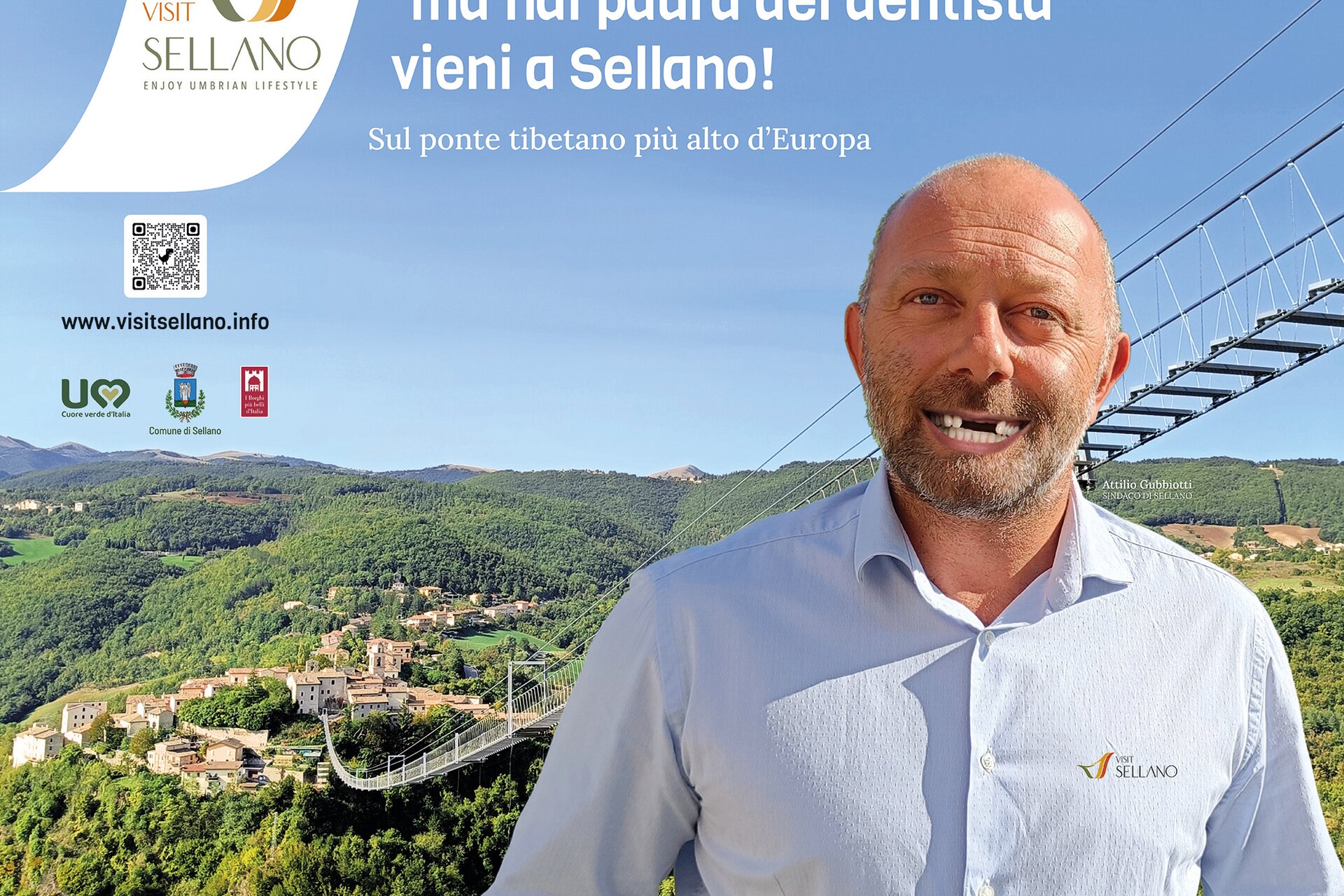 Foto: Un coraggioso e lungimirante Attilio Gubbiotti, sindaco di Sellano, posa "sdentato" per una delle visionarie campagne promozionali di Visit Sellano sullo slogan: "Se cerchi un ponte ma hai paura del dentista, vieni a Sellano - sul ponte tibetano più alto d'Europa". (Tipicità Festival 2025)
